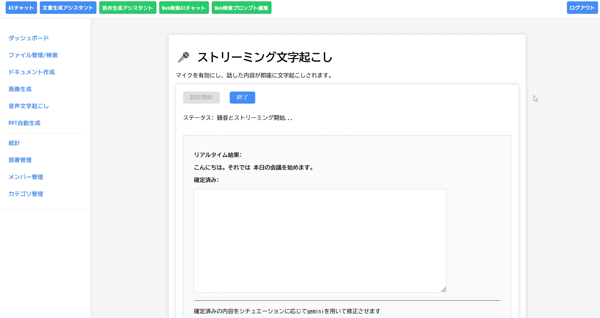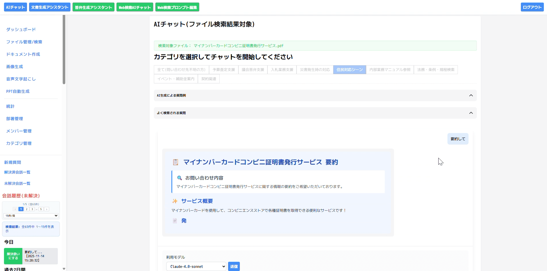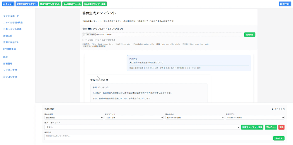 答弁作成、業務相談、文字起こし、要約まで。